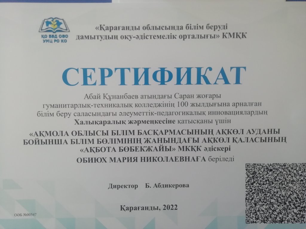 Педагоги приняли участие в Международной ярмарке социально – педагогических инноваций в сфере образования, посвященной 100-летию высшего гуманитарного колледжа им.Абая Кунанбаева г.Сарань. Посредством платформы ZOOM Тлеулина Г.Ж. Обиюх М.Н.,...
