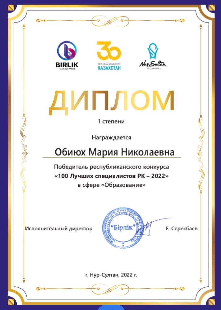 Педагог Обиюх М.Н. награждена Дипломом 1 степени и приглашена на «Форум 100 лучших специалистов РК- 2022».