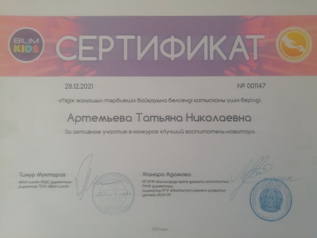 Педагоги "Ясли - сад "Акбота" 28 декабря 2021 года приняли участие в конкурсе "Лучший воспитатель - новатор"