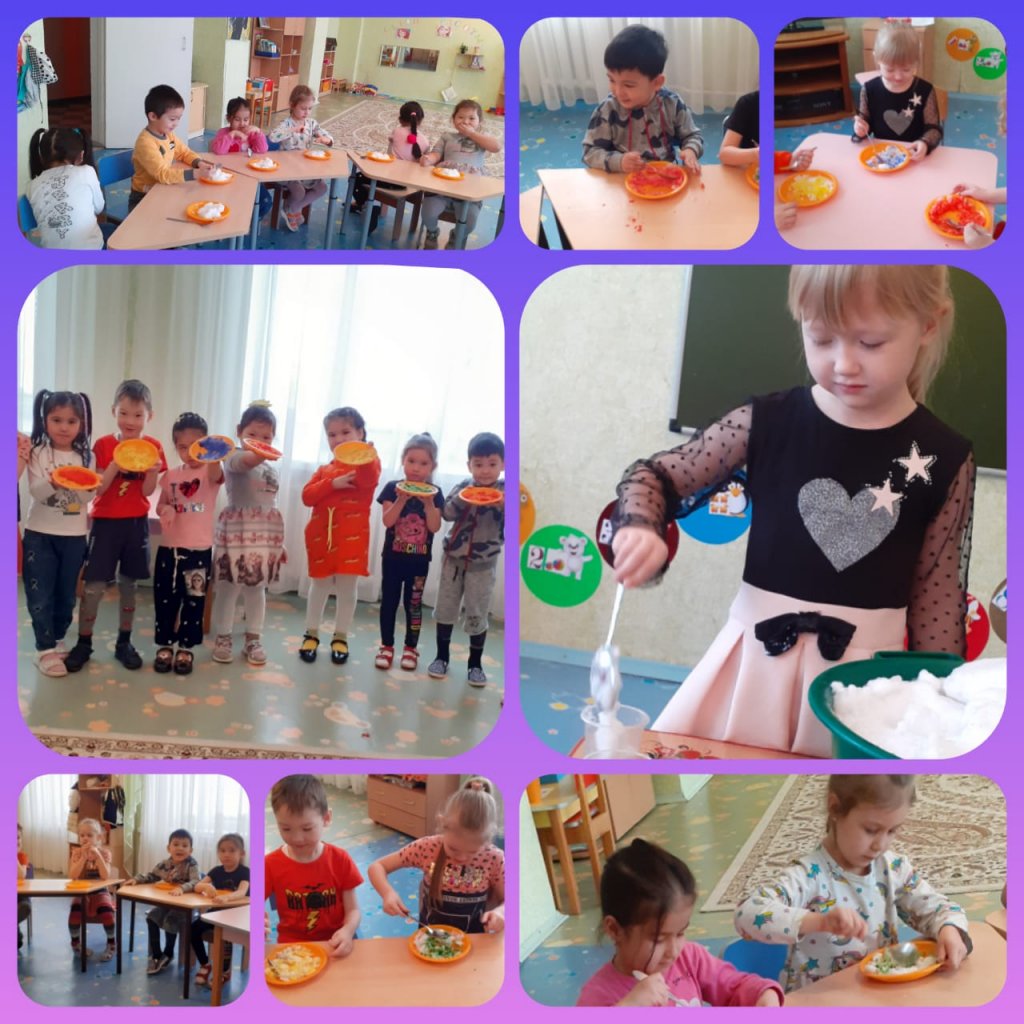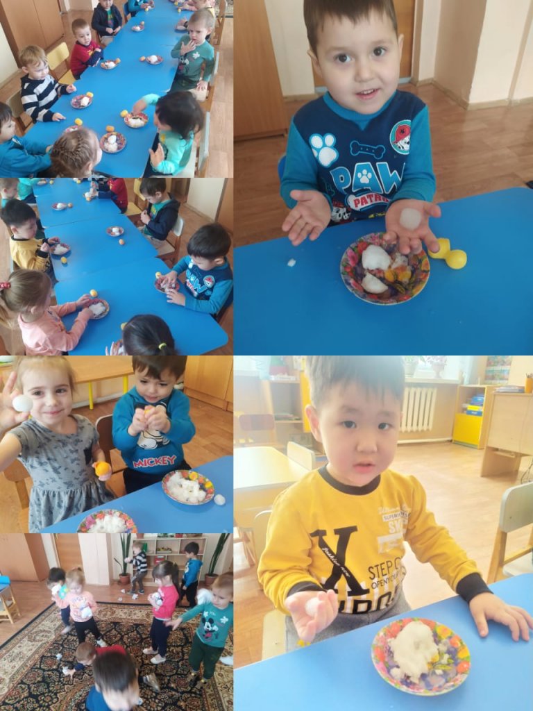 Дети узнали, что снег тает в тепле и превращается в воду.С помощью киндер сюрприза дети предавали форму снегу и делали не большие снежные комки.