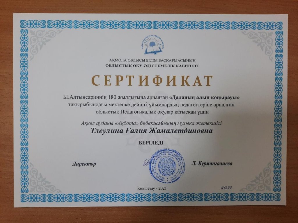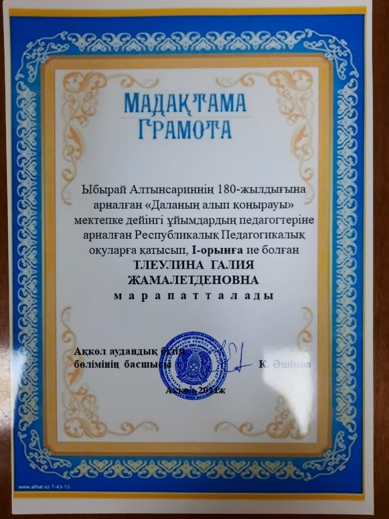 Тлеулина Г.Ж. награждена грамотой за занятое 1 место в районном конкурсе Республиканских педчтений «Даланың алып қонырауы» посвященный 180- летию Ыбырая Алтынсарина.