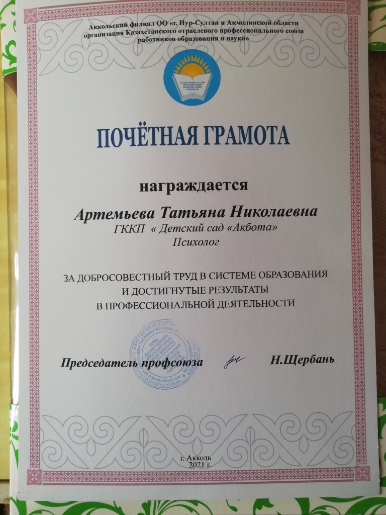Артемьева Т.Н.- Почетной грамотой от председателя профсоюза районного...