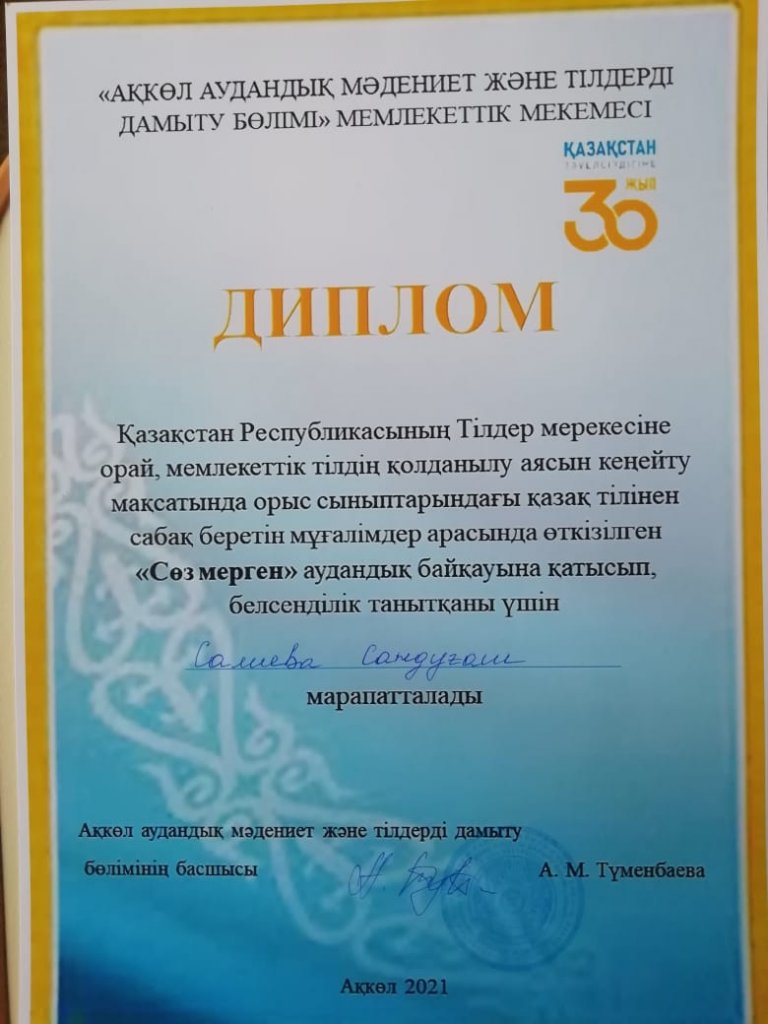 Салиева Сандугаш Камбаровна приняла участие в районном конкурсе «Сөз мерген» к Дню языков Республики Казахстан.