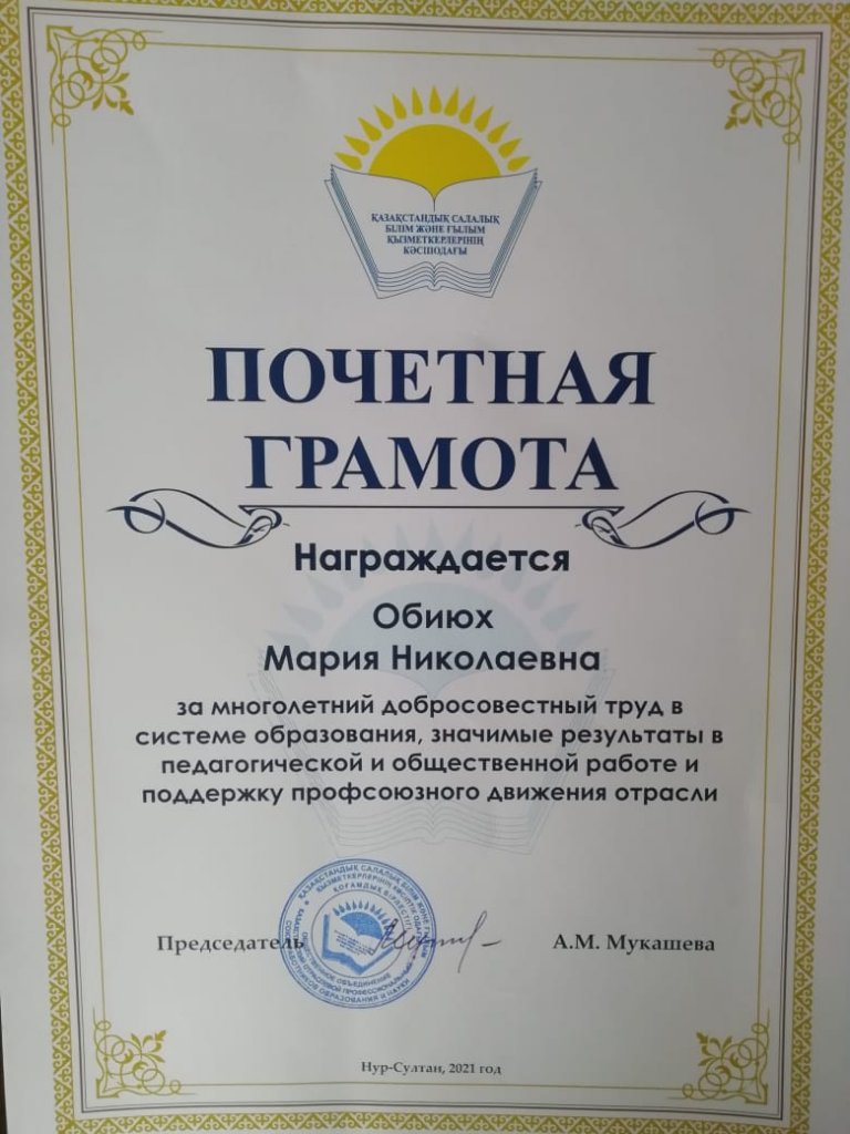Обиюх Мария Николаевна награждена Почетной грамотой от Казахстанского отраслевого профсоюза работников образования и науки.