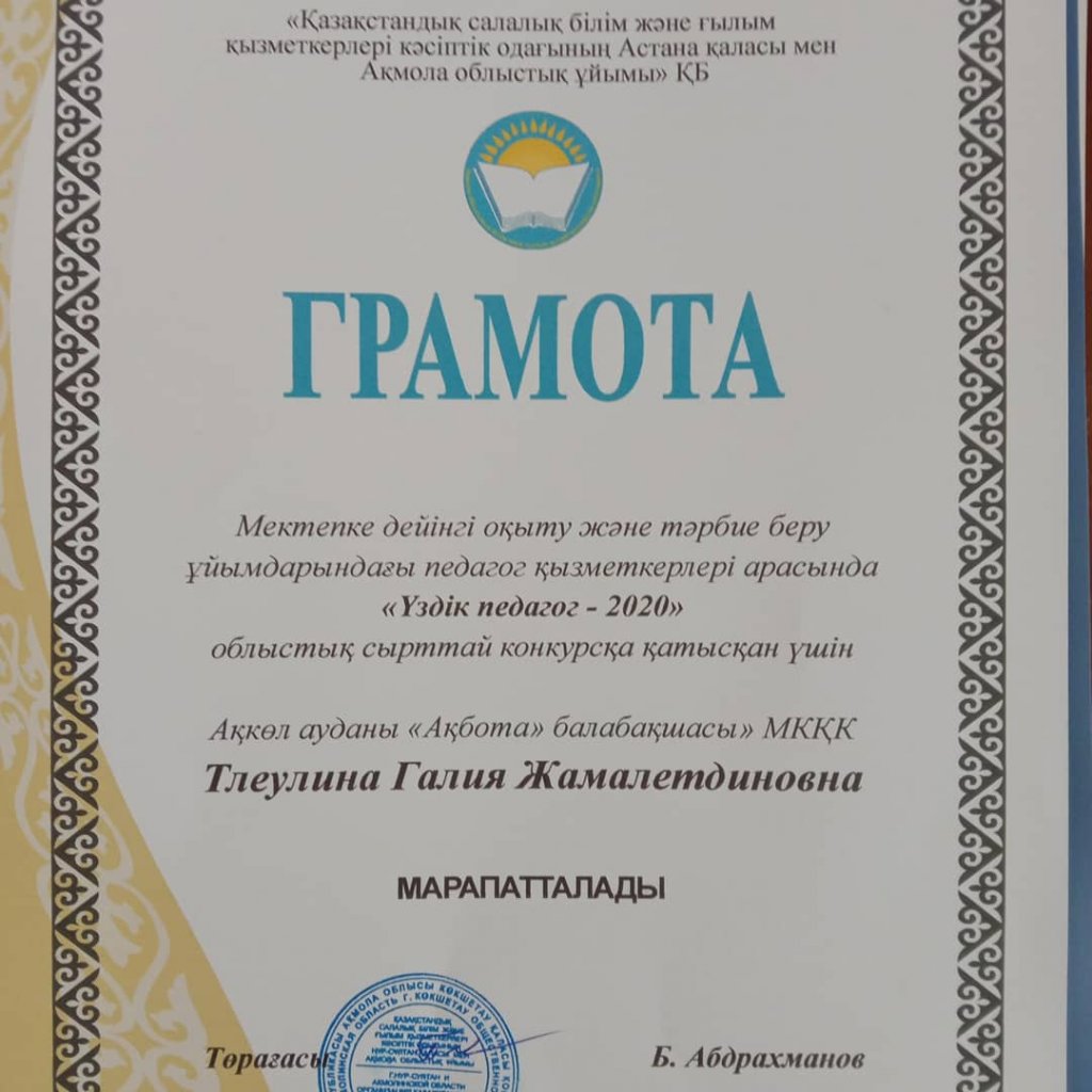 «Үздік тәрбиеші-2020» облыстық байқауының жеңімпазы